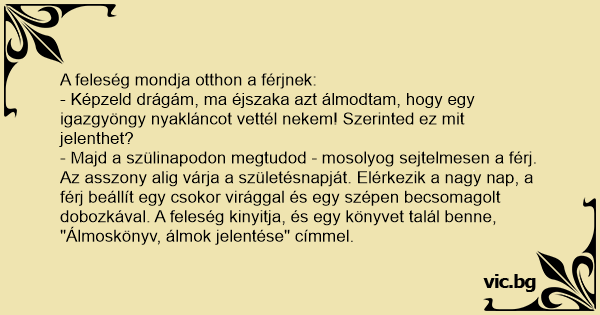 - Képzeld drágám, ma éjszaka azt álmodtam, hogy egy igazgyöngy nyakláncot vettél nekem! Szerinted ez mit jelenthet?