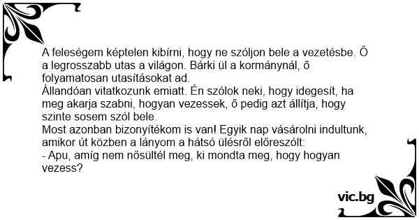 A feleségem képtelen kibírni, hogy ne szóljon bele a vezetésbe. Ő a legrosszabb utas a világon. Bárki ül a kormánynál, ő folyamatosan utasításokat ad.