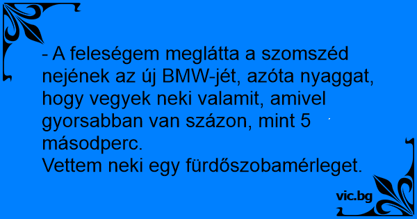 La maquina de los tres segundos Η ζυγαριά. Η επέτειος. Скъпи, за рожденият си ден искам нещо такова, че като стъпя на педала му да вдига до 100 за под три секунди! Жена ми започна да подмята какво иска за подарък за предстоящата ни годишнина: Милий, подаруй мені на 8 Березня, щось таке, що б ніжкою трохи придавила, а воно так раз, і від нуля до сотні за 3 секунди! Un Allemand, un Hollandais et un Belge sont assis dans le café. L'Allemand annonce fièrement : Une femme, peu avant Noel dit à son mari qu'elle aimerait recevoir quelque chose capable de monter de 0 à 100 en plus ou moins 4 secondes... My wife and I will be celebrating our wedding anniversary soon so i asked her what she wanted. She said wanted something really really shine that goes from 0 to 200 in about 3 seconds. Είναι τρεις τύποι λέει ο πρώτος A l’approche de Noël, un homme qui souhaite se voir offrir une moto donne des indices à sa femme : Treffen sich zwei Blondinen. Sagt die eine: My wife said wanted something shiny that went from 0-150 in under 2 seconds. Kommt meine Frau heute in den Garten nachdem sie den neuen BMW der Nachbarin erblickt hat: "Du, Hans, ich brauch auch so ein Ding mit dem ich innerhalb von fünf Sekunden auf Hundert komme!" "Naja, so habe ich ihr eine Badzimmerwaage gekauft..." Adam och Jonatan satt och skröt för varandra. Adam sa: - Min pappa har en sportbil som går från 0 till 100 km på sju sekunder. Jonatan kontrar: - Det var väl inget. Min pappa har en apparat som går från 0 till 100 på bara en sekund. - Du... Una esposa descontenta con su carro le dice a su marido: - Cariño, el día de San Valentín sorpréndeme y regálame algo que pase de 0 a 100 en 4 segundos, de ser posible de color azul. El marido le... — Любий! Подаруй мені те, що за 4 секунди розганяється від 0 до 100. — Ваги? - Hvad er det accelererer fra 0-100 på 0,5 sekunder? - Badevægten, når min svigermor bestiger den! - Kona ga meg et hint om hva hun ønsket seg på sin 50 års dag. - Hun sa at ønsket seg noe skinnende som går fra 0 til 100 på 3 sekunder. - Hva kjøpte du da? - Jeg kjøpte en baderomsvekt til henne. Tre drenge Tre drenge stod på et gadehjørne. Pludselig siger den ene: - Min far har en bil, der kan accelerere fra nul til hundrede på 6 sekunder. Den anden dreng siger: - Min far har en bil, der... 3 Vrienden zitten bij mekaar en ze praten over wat ze voor hun vrouw als verjaardagscadeau hebben gekocht. Zegt de eerste: "Ik heb voor mijn vrouw iets gekocht dat van 0 naar 100 gaat in 5... Mijn vrouw gaf me laatst een tip voor wat ze wenste voor haar volgende verjaardag.Ze zei: "Ik wil een rode en hij moet van 0 naar 130 gaan in 3 seconden." Ik kocht voor haar een weegschaal.Toen is... Vaimo tuli kotiin töistä ja sanoi miehelleen: - Kulta, minä haluaisin jotain pientä, metallinhohtoista joka kiihtyy muutamassa sekunnissa nollasta sataan. Seuraavana päivänä vaimo sai upeasti... Viime vuonna Pertti ei tiennyt mitä ostaa vaimolleen joululahjaksi. Vaimo antoi mielestään hyvän vihjeen: ”Olisi kiva jos tossa autotallin edessä olisi minulle sellainen lahja, joka menee nollasta... Mies oli autuaasti unohtanut vaimon syntymäpäivän ja vaimo naama punaisena huutaa pihalla: PRKL, jos huomenaamuna autotallin oven edessä ei ole jotain uutta, punaista ja mistä neula nousee 5... Nainen pyysi mieheltään syntymäpäivälahjaksi jotain mikä kiihtyisi nollasta sataan 3 sekunissa. - Mies toi vaa’an naiselle. Megkérdeztem a nejemet mit szeretne a születésnapjára. Azt mondta, legyen piros és 3 mp alatt gyorsuljon 0-ról 100-ra. Vettem neki egy piros fürdőszobamérleget. Azóta nem áll velem szóba. Min fru sa att hon i bröllopspresent, ville ha en sportig liten sak som gick från 0 till 100 på ett ögonblick. Så jag gick till Konsum och köpte en snygg badrumsvåg... Elle voulait un truc qui va de 0 à 100 en 2 secondes, je lui ait offert une balance, c'est là que notre dispute à commencé... A mulher faz aniversário e pede para o marido um presente. O que você quer de presente? Um que vai de 0 a 100 em 10 segundos. À noite o marido traz uma caixa e diz: — Seu presente está aqui! Ela... Tre killar sitter i bastun och skryter om vad de givit sina fruar i julklapp. Den första säger: - Gissa vad jag gav min fru? Den gör 100 på 5 sekunder! - Ingen aning, svarar de båda andra. - En... - Ma chérie, cette année, pour Noël, je vais t'offrir quelque chose qui passe de 0 à 100 en 1 seconde quand tu y montes. - Tu vas m'offrir unr voiture !? - Non, une balance ! Meine Frau letztens zu mir: "Schatz, wir sind doch Millionäre. Schenk mir doch mal zum Geburtstag etwas, was ganz schnell von Null auf 100 geht." Ihr dann eine Waage zu schenken, war auch wieder... My wife asked me to get her a birthday gift that was black and silver and went from 0 to 200 in six seconds. I got her a new bathroom scale... that's when the fighting really started. What goes up from 0 to 200 in less than 2 seconds? Yo mama's weight scale. Ζήτησε για τα γενέθλια της κάτι που να πηγαίνει 0 έως 100 σε 2 δευτερόλεπτα και της χάρισα μια ζυγαριά. Έτσι ξεκίνησε ο καυγάς… Una donna, scontenta della propria auto, dice al marito: "Tesoro, il giorno del mio compleanno potresti sorprendermi соn qualcosa che va da 0 a 100 in soli 4 secondi, preferibilmente blu!" AI suo...