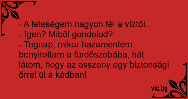 - Tegnap, mikor hazamentem benyitottam a fürdőszobába, hát látom, hogy az asszony egy biztonsági őrrel ül a kádban!