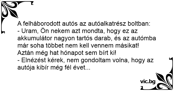 - Uram, Ön nekem azt mondta, hogy ez az akkumulátor nagyon tartós darab, és az autómba már soha többet nem kell vennem másikat! Aztán még hat hónapot sem bírt ki!