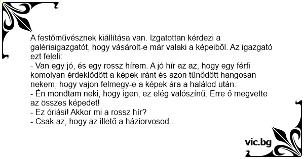 - Van egy jó, és egy rossz hírem. A jó hír az az, hogy egy férfi komolyan érdeklődött a képek iránt és azon tűnődött hangosan nekem, hogy vajon felmegy-e a képek ára a halálod után.