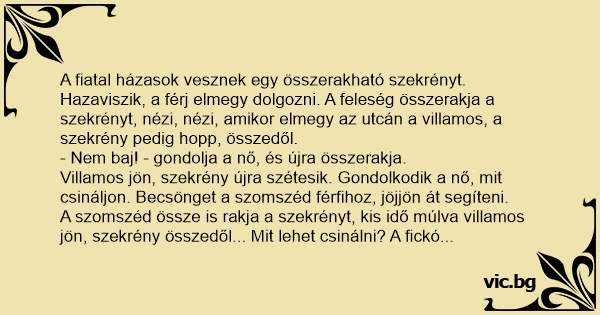 A szomszéd össze is rakja a szekrényt, kis idő múlva villamos jön, szekrény összedől... Mit lehet csinálni? A fickó javaslata: