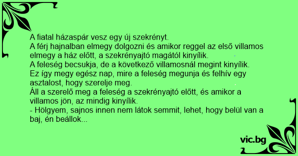 - Hölgyem, sajnos innen nem látok semmit, lehet, hogy belül van a baj, én beállok a szekrénybe, csukja rám az ajtót, hátha belülről látom, mi a hiba. – mondja a szerelő.