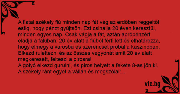 A golyó elkezd gurulni, és piros helyett a fekete 8-as jön ki. A székely ránt egyet a vállán és megszólal: