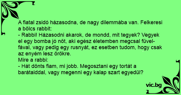 - Rabbi! Házasodni akarok, de mondd, mit tegyek? Vegyek el egy bomba jó nőt, aki egész életemben megcsal fűvel-fával, vagy pedig egy rusnyát, ez esetben tudom, hogy csak az enyém lesz örökre.