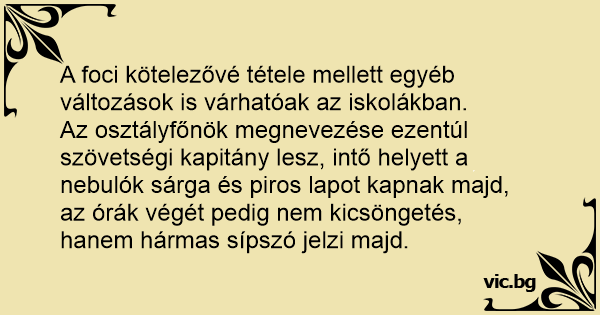Az osztályfőnök megnevezése ezentúl szövetségi kapitány lesz, intő helyett a nebulók sárga és piros lapot kapnak majd, az órák végét pedig nem kicsöngetés, hanem hármas sípszó jelzi majd.