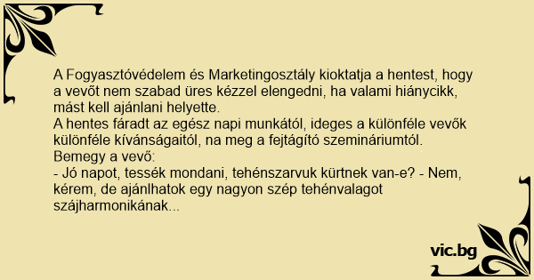 - Jó napot, tessék mondani, tehénszarvuk kürtnek van-e? - Nem, kérem, de ajánlhatok egy nagyon szép tehénvalagot szájharmonikának...