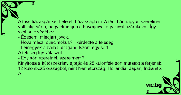 A friss házaspár két hete élt házasságban. A férj, bár nagyon szerelmes volt, alig várta, hogy elmenjen a haverjaival egy kicsit szórakozni. Így szólt a felségéhez: