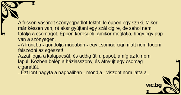 A frissen vásárolt szőnyegpadlót fekteti le éppen egy szaki. Mikor már készen van, rá akar gyújtani egy szál cigire, de sehol nem találja a csomagot. Éppen keresgéli, amikor meglátja, hogy egy púp van a szőnyegen.