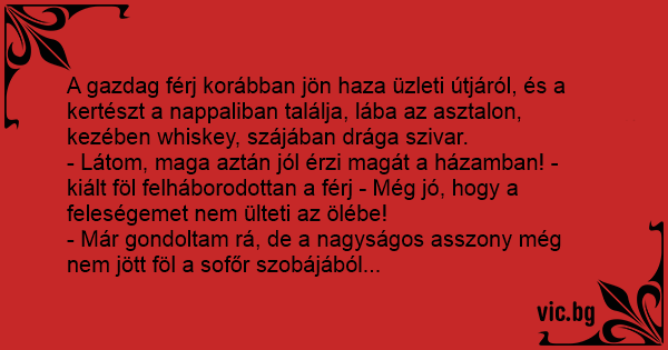 - Látom, maga aztán jól érzi magát a házamban! - kiált föl felháborodottan a férj - Még jó, hogy a feleségemet nem ülteti az ölébe!