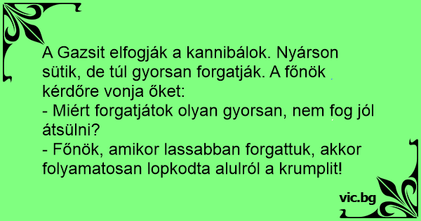Két kannibál elfog egy cigányt. Nyársra húzzák, és az egyik szép lassan elkezdi forgatni a tűz fölött... Megszólal a másiknak: - Gyere már ide, forgasd egy kicsit, míg hozok még tűzifát. De szép...