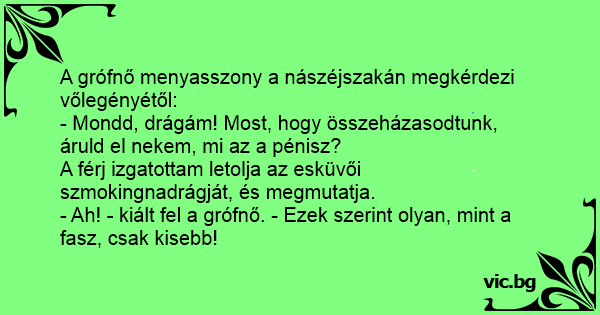 - Mondd, drágám! Most, hogy összeházasodtunk, áruld el nekem, mi az a pénisz?