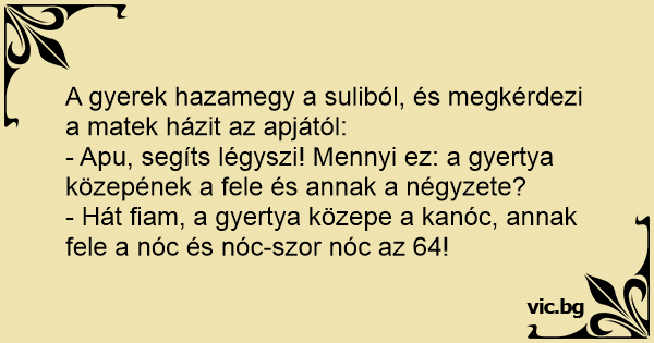 A gyerek hazamegy a suliból, és megkérdezi a matek házit az apjától: