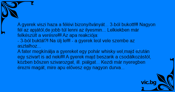 A gyerek viszi haza a félévi bizonyítványát... 3-ból bukott!!! Nagyon fél az apjától,de jobb túl lenni az ilyesmin... Lelkiekben már felkészült a verésre!!! Az apa reakciója: