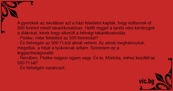 - Rendben, Pistike nagyon ügyes vagy. És te, Móricka, mihez kezdtél az 500 Ft-tal?