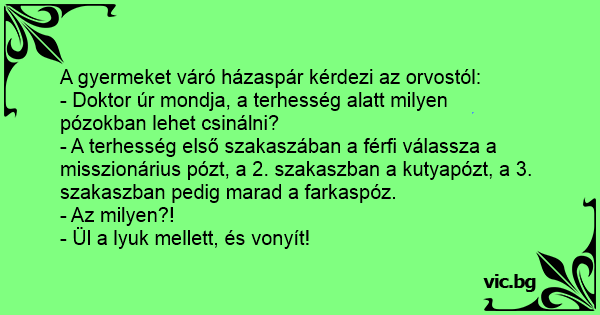 - Doktor úr, a feleségem terhes lett, ezért szeretném megkérdezni, hogy ezentúl hogyan csináljuk a szexet? - Hát kedves uram, az első hónapokban csinálhatják teljesen normálisan, majd a terhesség...