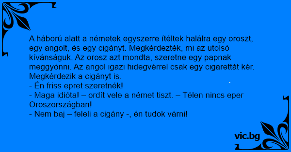 A háború alatt a németek egyszerre ítéltek halálra egy oroszt, egy angolt, és egy cigányt. Megkérdezték, mi az utolsó kívánságuk. Az orosz azt mondta, szeretne egy papnak meggyónni. Az angol igazi hidegvérrel csak egy cigarettát kér.