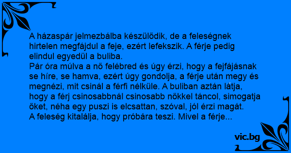 Pár óra múlva a nő felébred és úgy érzi, hogy a fejfájásnak se híre, se hamva, ezért úgy gondolja, a férje után megy és megnézi, mit csinál a férfi nélküle. A buliban aztán látja, hogy a férj csinosabbnál csinosabb nőkkel táncol, simogatja őket, néha egy puszi is elcsattan, szóval, jól érzi magát.