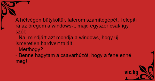 A hétvégén bütyköltük faterom számítógépét. Telepíti rá az öregem a windows-t, majd egyszer csak így szól: