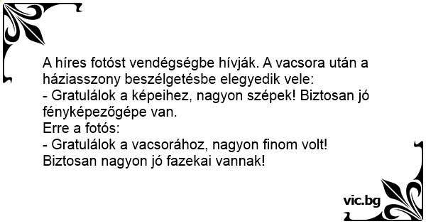 - Gratulálok a vacsorához, nagyon finom volt! Biztosan nagyon jó fazekai vannak!