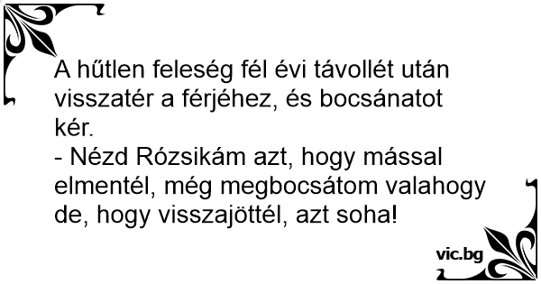 - Nézd Rózsikám azt, hogy mással elmentél, még megbocsátom valahogy de, hogy visszajöttél, azt soha!