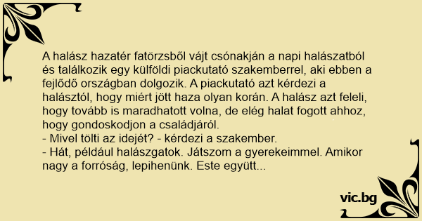 A halász hazatér fatörzsből vájt csónakján a napi halászatból és találkozik egy külföldi piackutató szakemberrel, aki ebben a fejlődő országban dolgozik. A piackutató azt kérdezi a halásztól, hogy miért jött haza olyan korán. A halász azt feleli, hogy tovább is maradhatott volna, de elég halat fogott ahhoz, hogy gondoskodjon a családjáról.