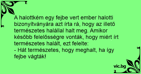 A halottkém egy fejbe vert ember halotti bizonyítványára azt írta rá, hogy az illető természetes halállal halt meg. Amikor később felelősségre vonták, hogy miért írt természetes halált, ezt felelte: