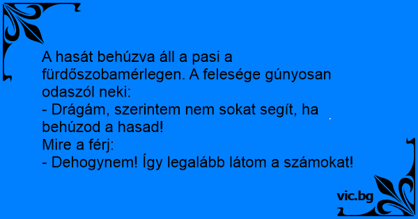 A férj áll a fürdőszobamérlegen, és a hasát próbálja meg behúzni. - Nem hiszem, hogy ez segítene a súlyodon - mondja neki a felesége. - Dehogynem, mert így legalább látom a számokat!