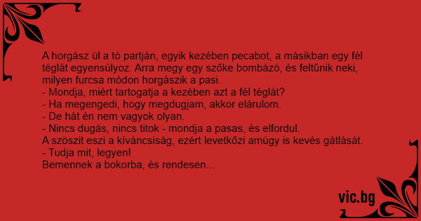 - Szóval az van, hogy egész nap itt ülök, de ezzel a bottal még egyetlen kapásom sem volt. Viszont ezzel a fél téglával, 2 óra alatt maga a harmadik.