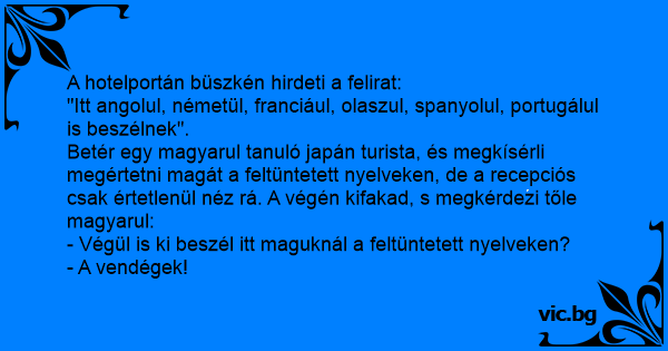 Betér egy magyarul tanuló japán turista, és megkísérli megértetni magát a feltüntetett nyelveken, de a recepciós csak értetlenül néz rá. A végén kifakad, s megkérdezi tőle magyarul: