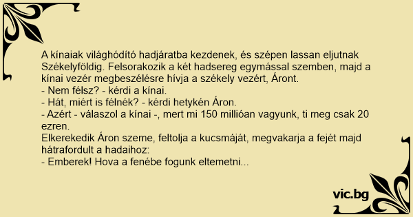 - Azért - válaszol a kínai -, mert mi 150 millióan vagyunk, ti meg csak 20 ezren.