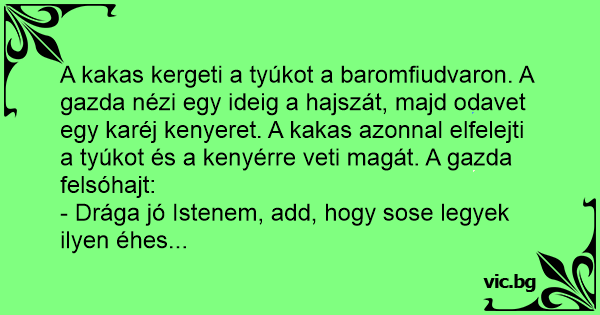 A kakas kergeti a tyúkot a baromfiudvaron. A gazda nézi egy ideig a hajszát, majd odavet egy karéj kenyeret. A kakas azonnal elfelejti a tyúkot és a kenyérre veti magát. A gazda felsóhajt:
