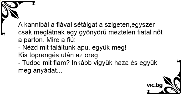 A kannibál a fiával sétálgat a szigeten,egyszer csak meglátnak egy gyönyörű meztelen fiatal nőt a parton. Mire a fiú: