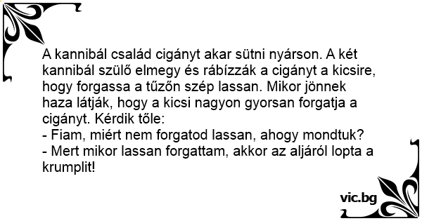 Két kannibál elfog egy cigányt. Nyársra húzzák, és az egyik szép lassan elkezdi forgatni a tűz fölött... Megszólal a másiknak: - Gyere már ide, forgasd egy kicsit, míg hozok még tűzifát. De szép...