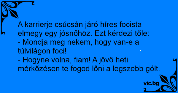 A karrierje csúcsán járó híres focista elmegy egy jósnőhöz. Ezt kérdezi tőle:
