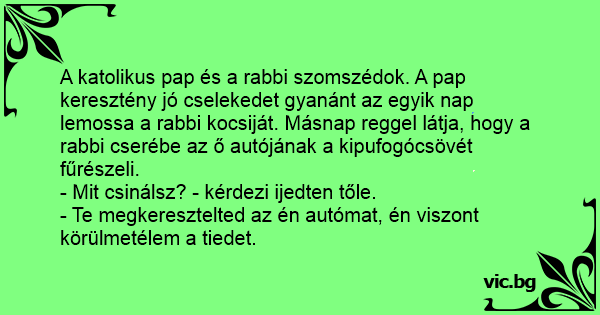 A katolikus pap és a rabbi szomszédok. A pap keresztény jó cselekedet gyanánt az egyik nap lemossa a rabbi kocsiját. Másnap reggel látja, hogy a rabbi cserébe az ő autójának a kipufogócsövét fűrészeli.