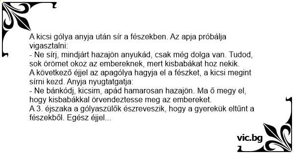 - Ne sírj, mindjárt hazajön anyukád, csak még dolga van. Tudod, sok örömet okoz az embereknek, mert kisbabákat hoz nekik.