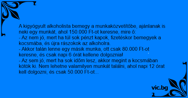 A kigyógyult alkoholista bemegy a munkaközvetítőbe, ajánlanak is neki egy munkát, ahol 150.000 Ft-ot keresne, mire ő: