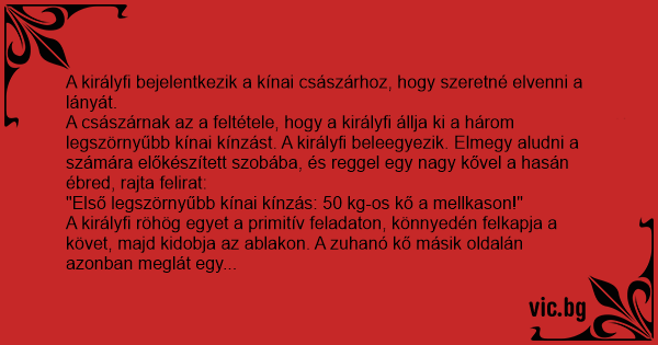 A császárnak az a feltétele, hogy a királyfi állja ki a három legszörnyűbb kínai kínzást. A királyfi beleegyezik. Elmegy aludni a számára előkészített szobába, és reggel egy nagy kővel a hasán ébred, rajta felirat: