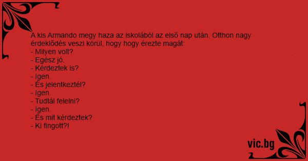 A kis Armando megy haza az iskolából az első nap után. Otthon nagy érdeklődés veszi körül, hogy hogy érezte magát: