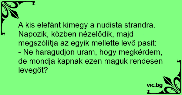 A kis elefánt kimegy a nudista strandra. Napozik, közben nézelődik, majd megszólítja az egyik mellette levő pasit: