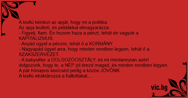 Едно дете го прашува својот татко: - Тато што е тоа политика? - Епа тоа ти е вака сине: Јас во фамилијава заработувам, значи јас сум капитализам, јас им плаќам на чистачката и дадилката значи тие...