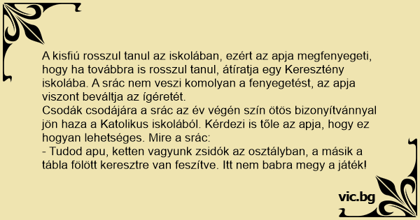- Tudod apu, ketten vagyunk zsidók az osztályban, a másik a tábla fölött keresztre van feszítve. Itt nem babra megy a játék!