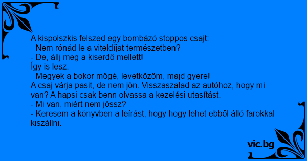 A csaj várja pasit, de nem jön. Visszaszalad az autóhoz, hogy mi van? A hapsi csak benn olvassa a kezelési utasítást.