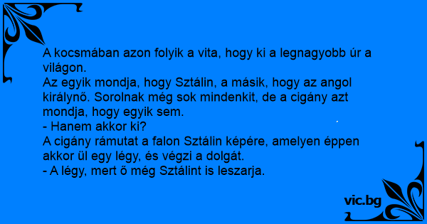 Az egyik mondja, hogy Sztálin, a másik, hogy az angol királynő. Sorolnak még sok mindenkit, de a cigány azt mondja, hogy egyik sem.