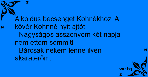 Koldus all az ajtó elott: - Asszonyom, három napja nem ettem! - Bár nekem lenne ilyen akarateróm!