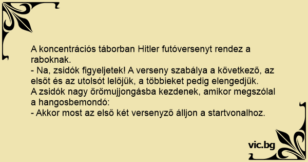 - Na, zsidók figyeljetek! A verseny szabálya a következő, az elsőt és az utolsót lelőjük, a többieket pedig elengedjük.