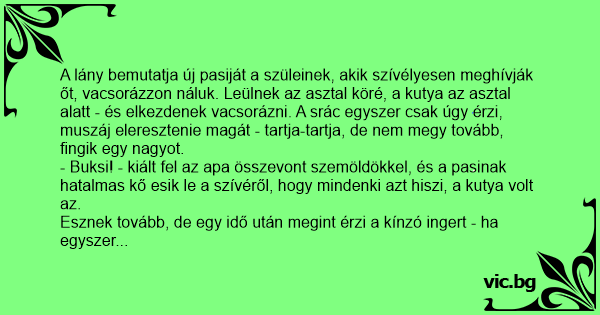 - Buksi! - kiált fel az apa összevont szemöldökkel, és a pasinak hatalmas kő esik le a szívéről, hogy mindenki azt hiszi, a kutya volt az.
