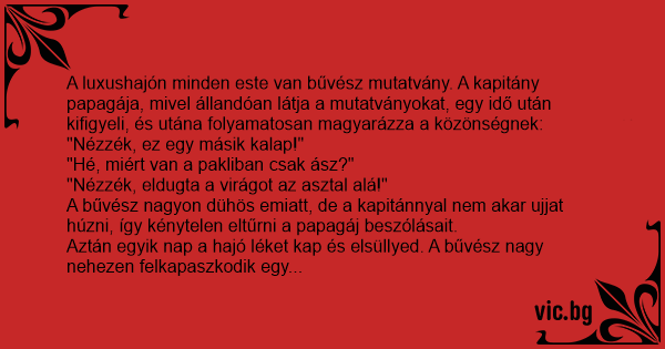 На един кораб за далечно плаване работел фокусник. Фокусник работил на кораб. The Magician and the Parrot Παπαγάλος-Καρφί Ο παπαγάλος του Καπετάνιου Πού είναι;. На одном корабле работал фокусник. Ein Zauberer soll auf einem Kreuzfahrtsschiff für Unterhaltung sorgen. Er hat einen Papageien dabei, der ihm jede Nummer verpatzt. Immer plappert er dazwischen: На един кораб работел фокусник. A magician worked on a cruise ship in the Caribbean. The audience would be different each week, so the magician did the same tricks each week. However, there was a problem, the captain's parrot saw the shows each week and began to understand how the magician did every trick. Once he understood,... A magician had landed a comfortable job on a cruise ship. His act was rendered hilarious by his parrot who would ridicule the magician after every trick, saying "Big deal, the cards up his sleeve." or "He put the ball in a hidden floor, the big faker!" One night the ship began to sink and while... Primeira e única viagem do Titanic. Na véspera do grande desastre, um dos passageiros, Mister M, o senhor de todos os sortilégios e azarilégios e príncipe dos dedo-duros, resolveu fazer um show. Mas, para o seu desespero, durante todo o espetáculo um papagaio ficava antecipando o que o mágico ia... En illusionist som arbetade på ett kryssningsfartyg hade en papegoja som alltid fördärvade hans nummer. Fågelns skrek till åskådarna: - Han har kortet i fickan, eller - Han har kortet i... En skicklig trollkarl uppträdde varje kväll på ett kryssningsfartyg. Han hade förmodligen gjort succe om det inte funnits en pratsam papegoja ombord. Varje gång han trollade bort ett kort skrek... Titaniğin salonlarından birinde her akşam bir sihirbaz gösteri yapıyormuş. Adam gerçekten çok ustaymış ama bir sorunu varmış. Salonun bir köşesinde bulunan papağan, tam ne sihirdir ne keramet... Det var en gång en trollkonstnär som trollade på en båt. Han hade det ganska bra där men det fanns en sak som han hatade och det var en papegoja som var skicklig på att se hur trollkonstnären... A magician worked on a cruise ship. The audience was different each week, so the magician did the same tricks over and over again. They stared at each other with hatred, but did not utter a word.... Een goochelaar zit op een cruise schip en doet allerlei trucjes. Maar elke keer zegt een papegaai: "De kaart zit in je broekzak!" of "Dat konijn kwam uit die doos!". Nou, die goochelaar is het na... En tryllekunstner jobber ombord på et cruiseskip i Karibien. Publikumet var forskjellig fra uke til uke, så han tillot seg selv å utføre de samme triksene om og om igjen. Det var bare et problem;... Iluzjonista z tresowaną papugą był jedną z atrakcji wieczornego programu na statku wycieczkowym. Niestety za każdym razem, kiedy magik robił jakąś sztuczkę, papuga zdradzała sekret i skrzeczała: -... En tryllekunstner arbejde på et krydstogtskib i Karibien. Tilskuerne var derfor nye hver uge, så tryllekunstneren tillod sig, at bruge de samme tricks uge efter uge. Eneste problem: Kaptajnens... Der Zauberer und der Papagei Die Geschichte spielt auf einem riesengroßen Passagierschiff, welches auf dem Pazifik kreuzt. Im großen Saal finden jeden Abend zur Unterhaltung der Gäste... Um mágico trabalhava emum navio, fazendo shows para os passageiros. O públicoeradiferente a cada semana, então o mágico sempre repetia os mesmos truques. O papagaio do capitão via os shows e... Ombord på Titanic hadde tryllekunstneren store problemer med papegøyen som alltid avslørte tricksene hans. Da skipet sank ble de to drivende på samme planke. Etter å ha sett stygt på hverandre... Um mágico trabalhava num navio. O papagaio do comandante via todos os espetáculos do mágico e contava para a platéia como eram os truques. A cada truque ele gritava: — O coelho está na... Utazik a hajón egy bűvész, aki úgy gondolja, hogy ledolgozza az útiköltséget és minden este bűvészmutatványokkal kápráztatja el a nagyérdeműt... Nem számol azonban a kapitány átok papagájával,... Um mágico foi contratado para apresentar seu show num navio. Porém,o papagaio do capitão, muito sacana,sempre revelava os truques das mágicas. O mágico já tava de saco cheio de ter todos os seus... Um mágico é contratado por um navio para alegrar os passageiros durante as viagens fazendo mágicas. O papagaio do capitão de tanto ver os truques decora eles. Em outra viagem o magico começa a... Ombord på et skib Ombord på et skib var der en tryllekunstner som tryllede med kort. Hver gang sad der en papegøje og skreg: Han har det op i ærmet, eller han har det nede i lommen. En aften stødte...